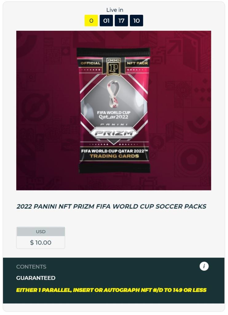 DETAILS:  The 2022 Panini NFT Prizm World Cup packs contain three NFTs per pack. Each pack guarantees: two Base NFTs (#’d to 1399) and one Auto, Parallel or Insert NFT (#’d to 149). Download the checklist here