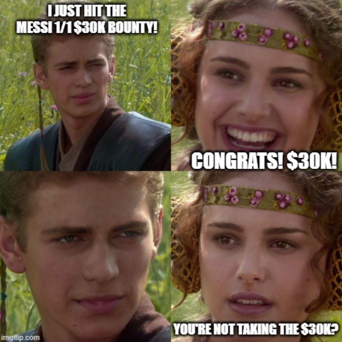 Waking up Christmas Eve morning we all saw the news. Messi 1/1 had been pulled. Spino had been in contact with the owner, offered the bounty, and now we all sit and wait for the sale to come through Discord right? RIGHT?
